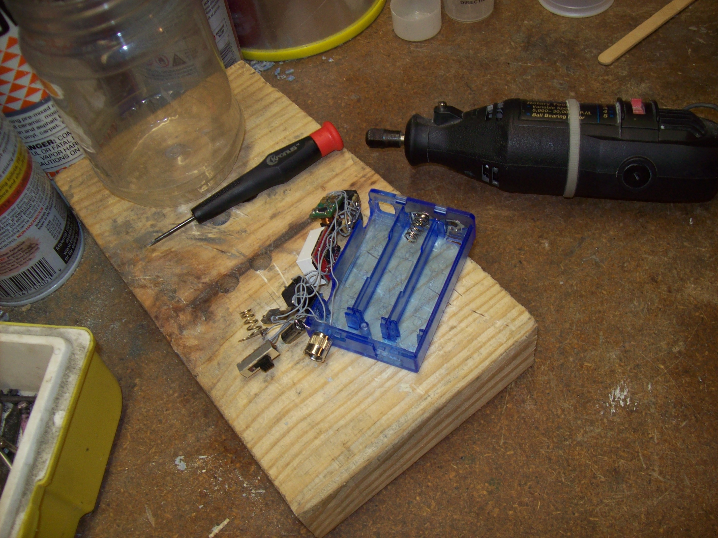 First I dremeled all the holes needed for the atty connector, button, charge jack, voltage adjusting pot. This plastic is brittle, so I had to be very careful not to crack it by using too much force. A dremel tool worked great for cutting it, because it just melted through from the high speed of the bit. It still took a steady hand and more patience than I am used to, since I couldn’t fix any mistakes with filler.