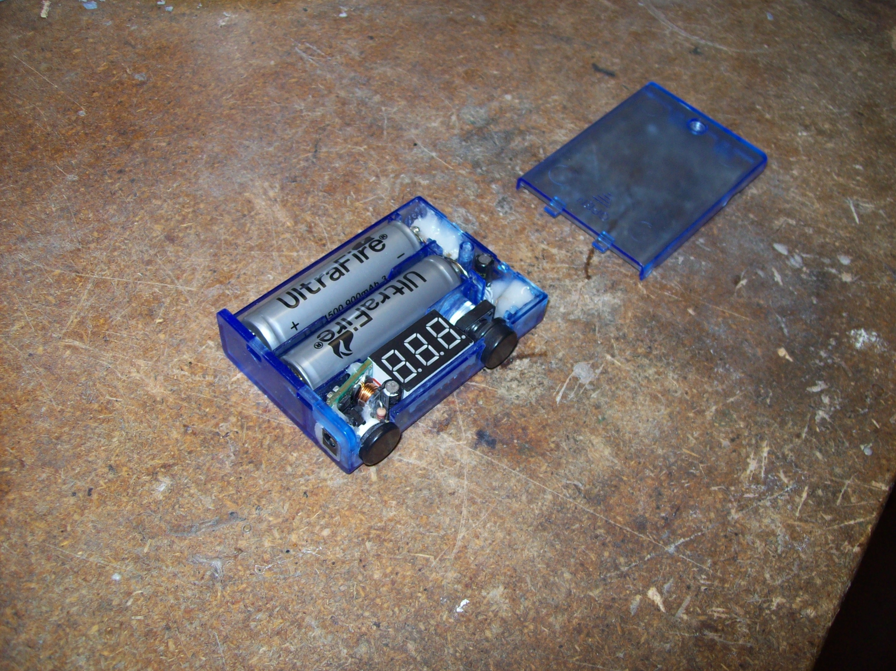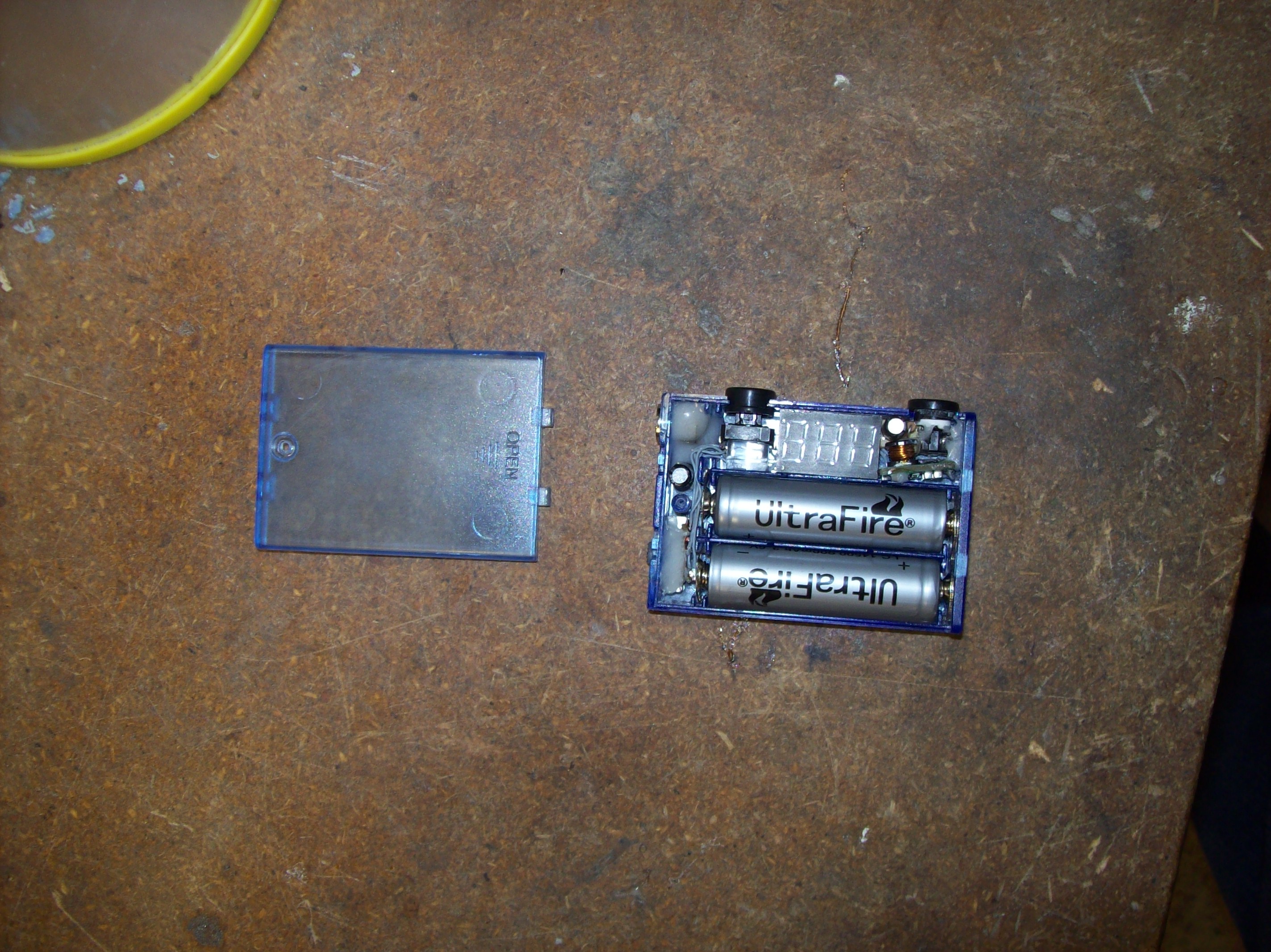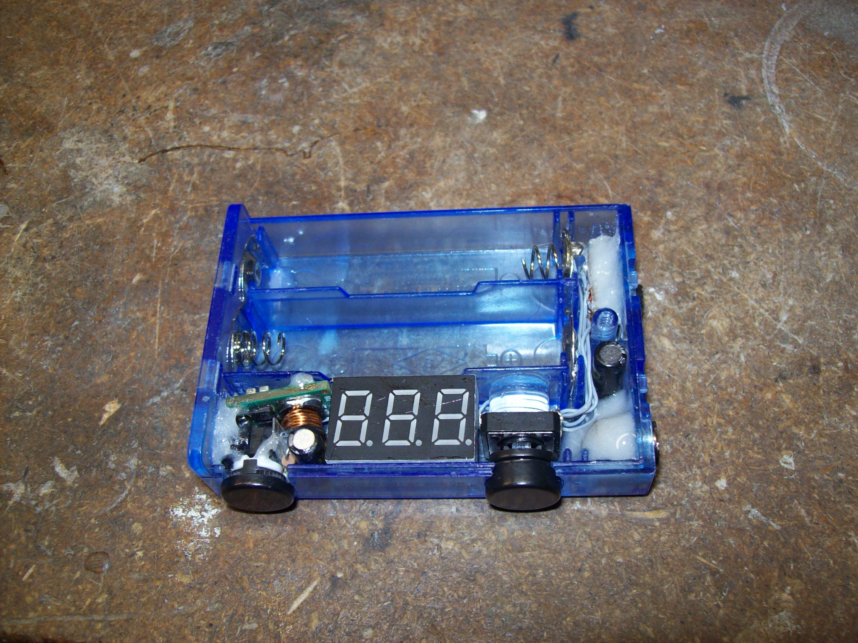The voltmeter board was cut down a little to fit in the AA size space. It fit surprisingly perfect.