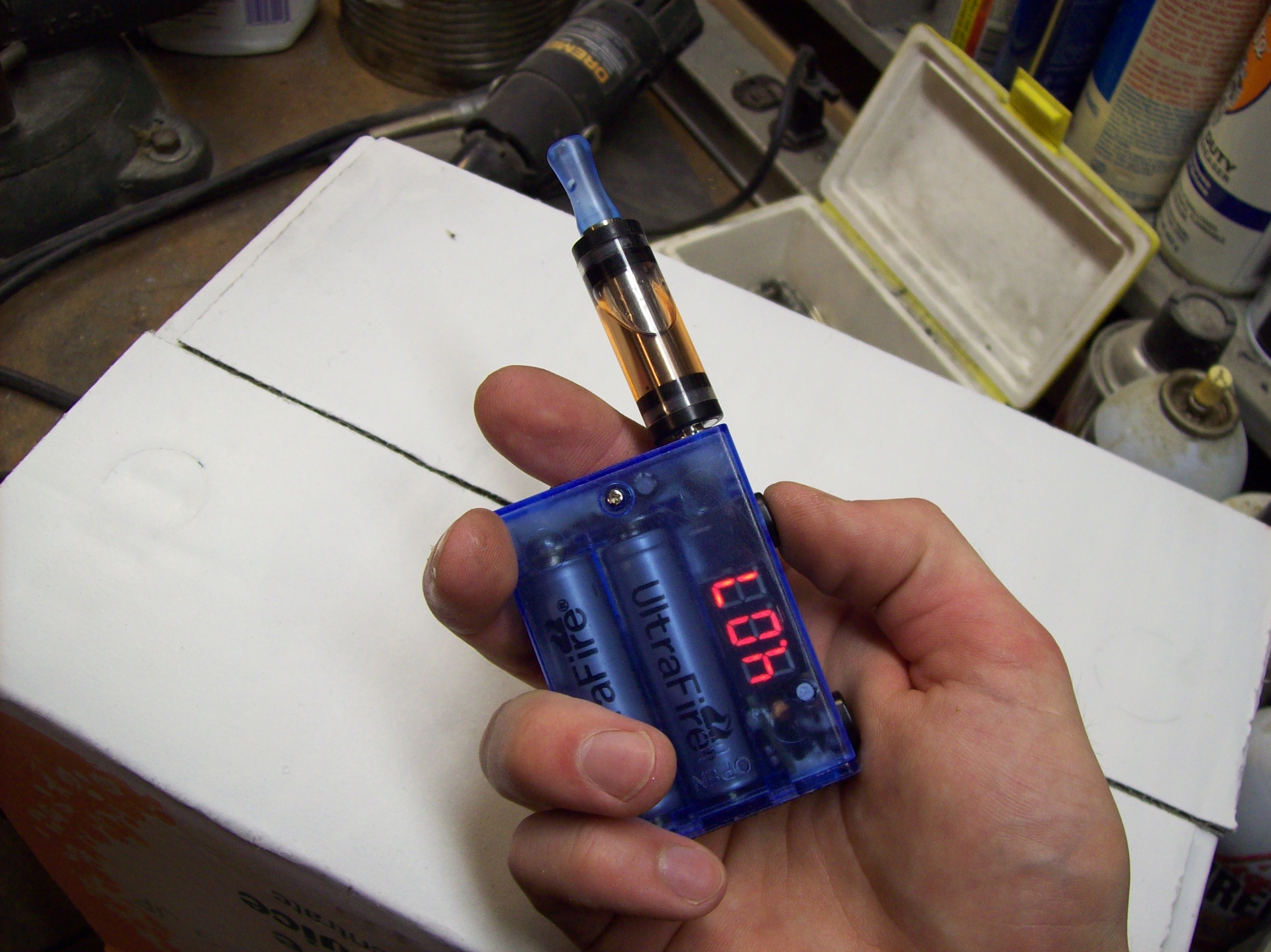This is a from-scratch mod I built for my brother. Seen here with MadVapes 3.5ml dual coil tank filled with their delicious irish mintz juice.