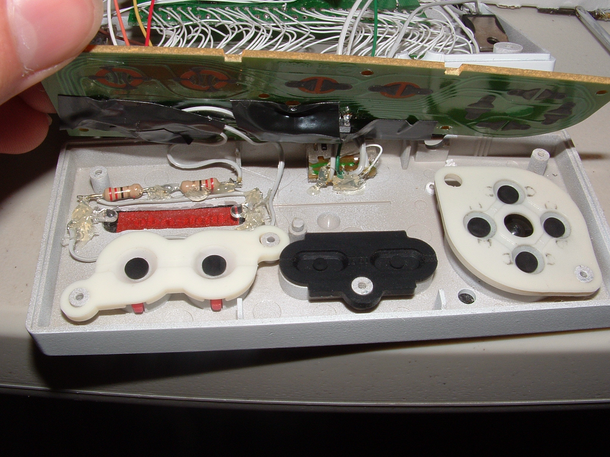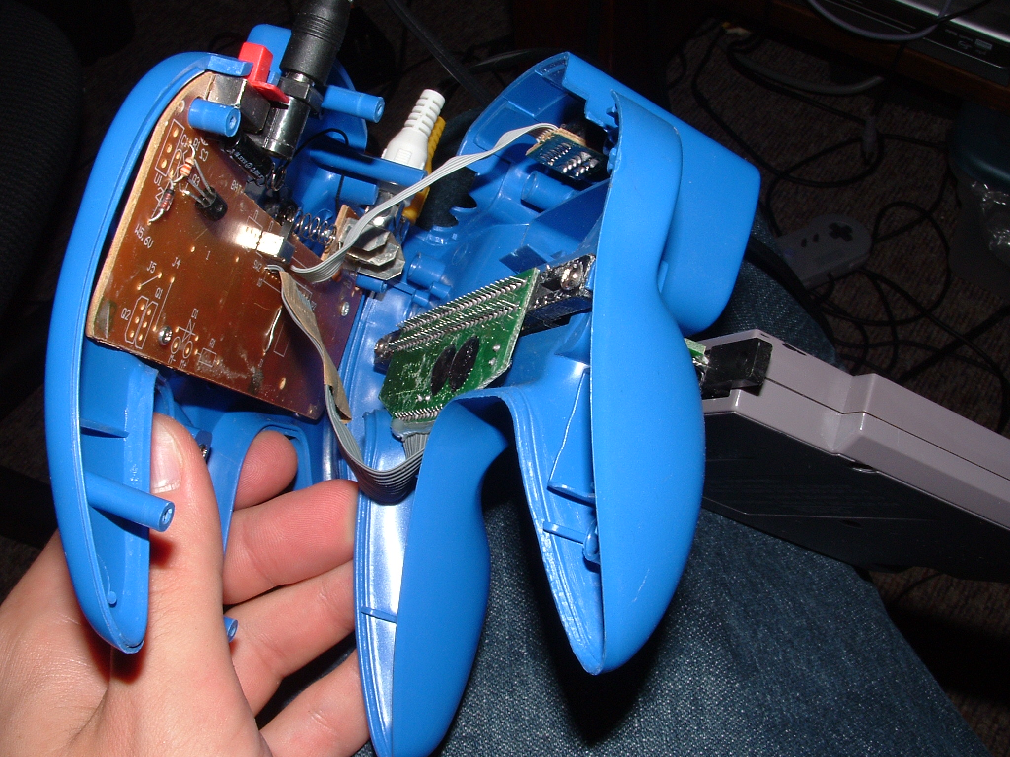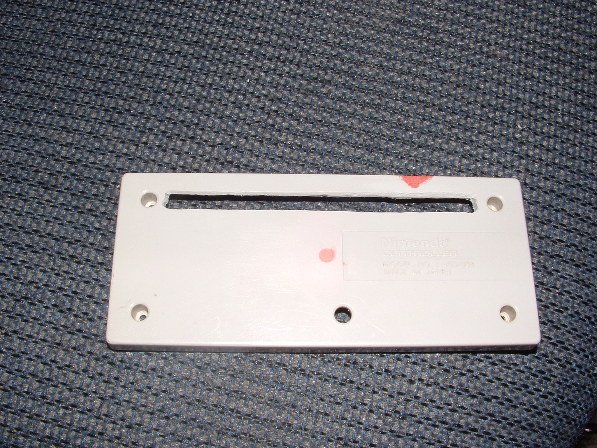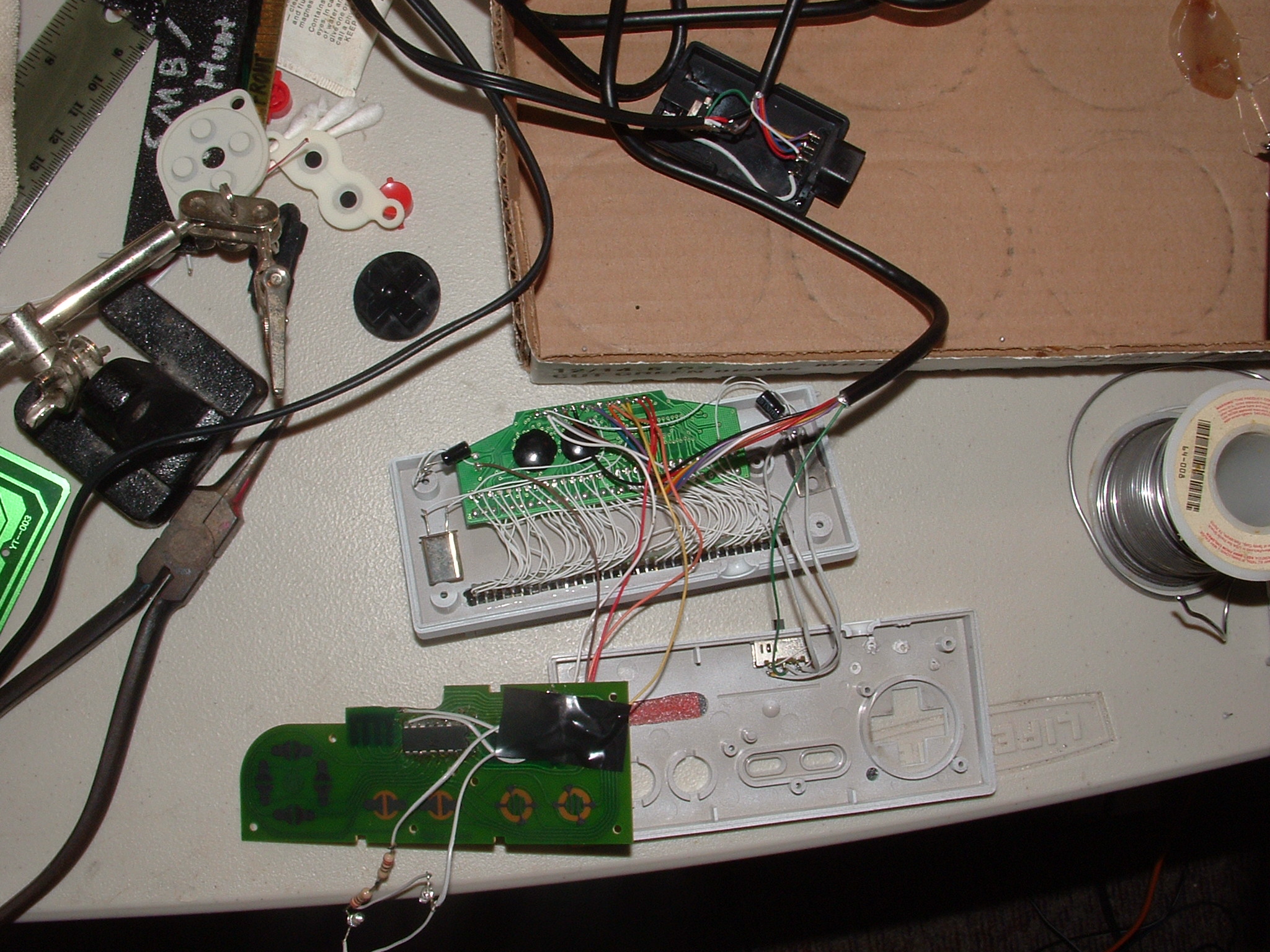The original NES control board was used. To give enough room underneath for the NES clone, the controller chip was flipped to the top of the controller, and pins bent over to connect to the original traces. Room for the power switch had be cut out as well and the traces rewired.