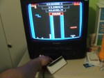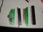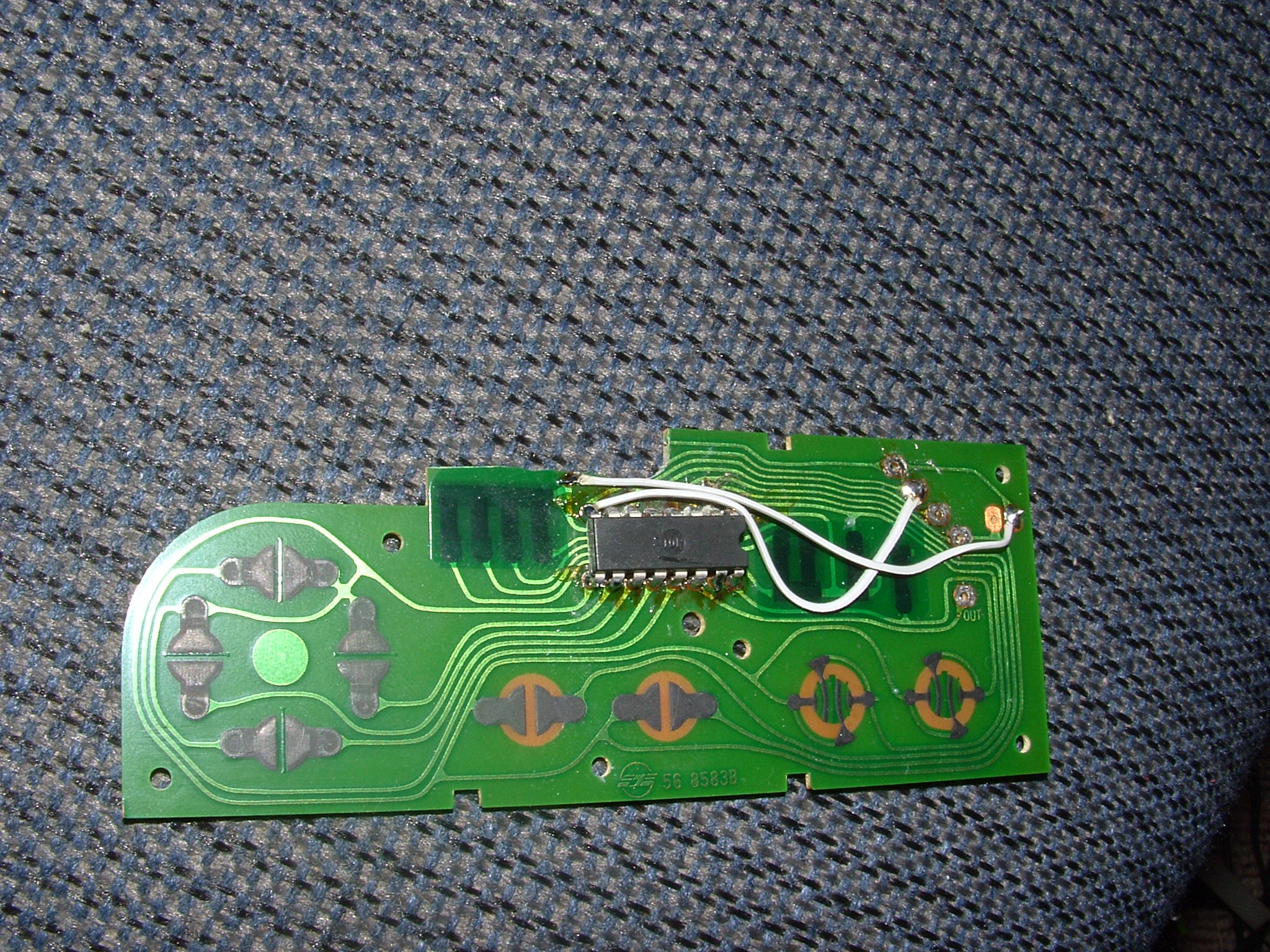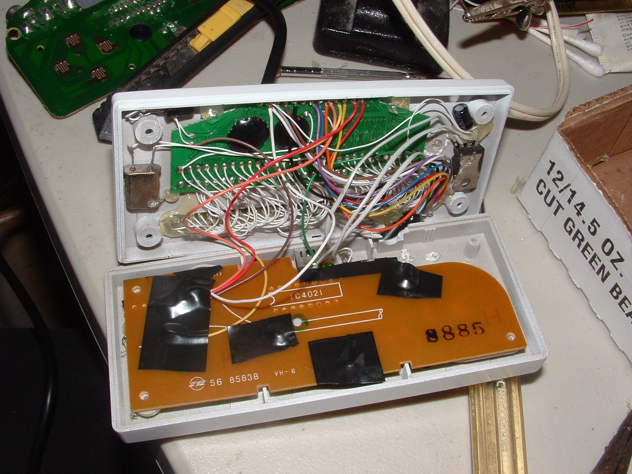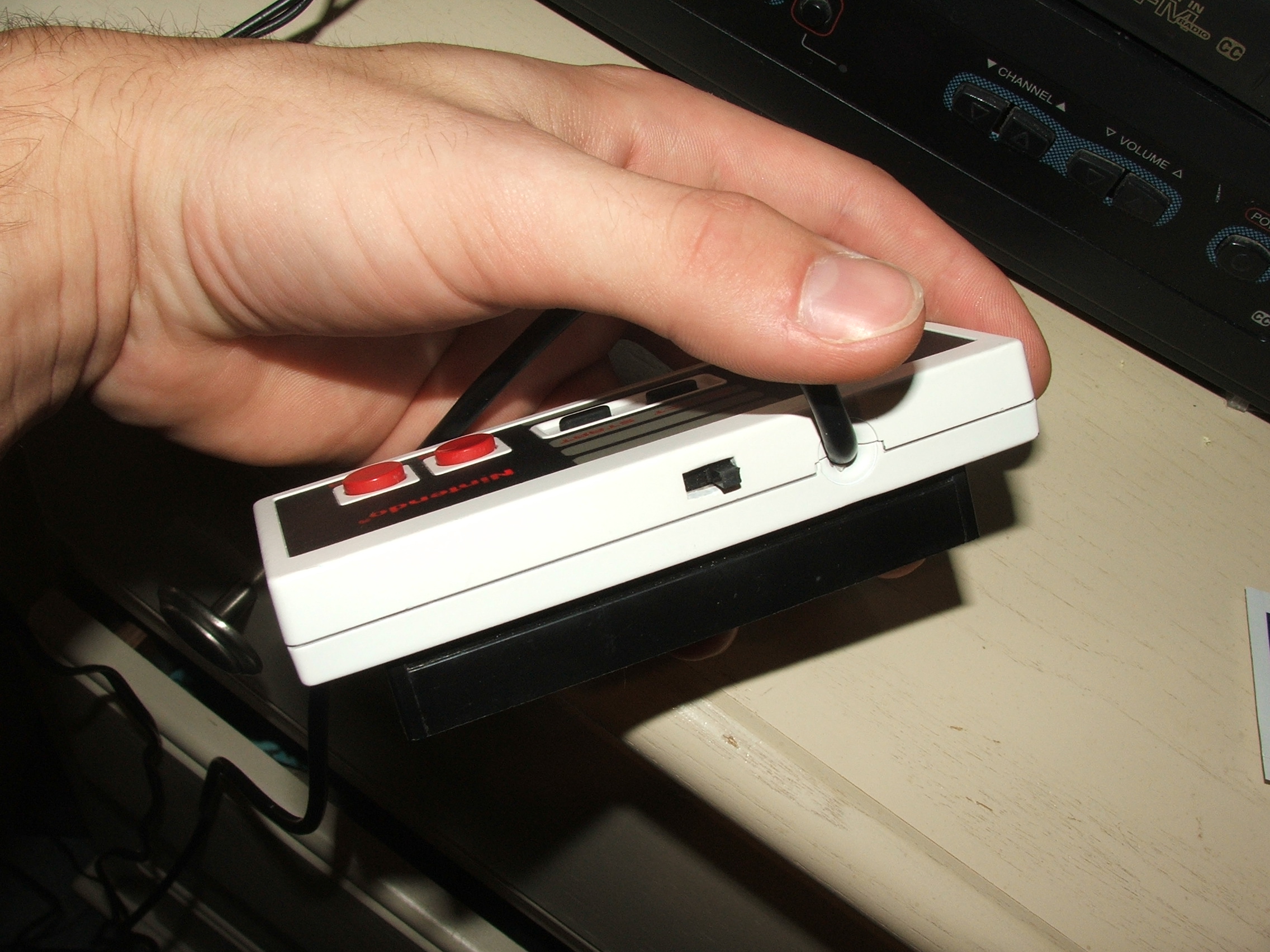 The original NES control board was used. To give enough room underneath for the NES clone, the controller chip was flipped to the top of the controller, and pins bent over to connect to the original traces. Room for the power switch had be cut out as well and the traces rewired.