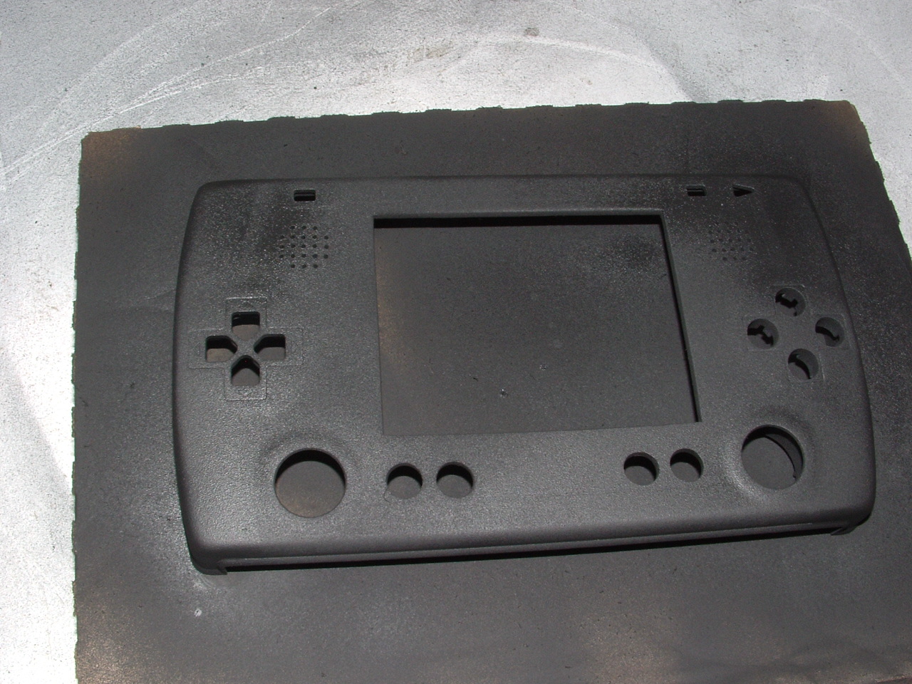 I decided to use smaller speakers than the PSone screen came with. The speakers from a Hip Gear LCD matched up so I used them. To get speaker holes I clamped a piece of scrap PCB to the case to give me a nice even pattern to follow, and then drilled through the holes.